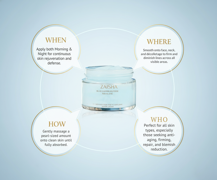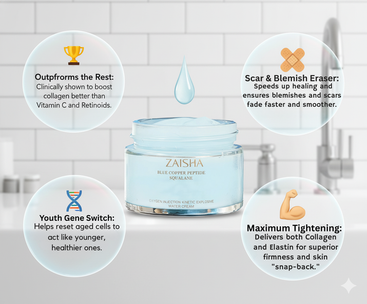 Your Age Reset Stop the clock on your skin. Our advanced ZAISHA GHK-Cu Cream is scientifically proven to signal deep repair, using the same molecule found in young, healthy skin.This velvety blue cream rebuilds your skin's structure from within. It leaves your face feeling visibly tighter, smoother, and perfectly clear.